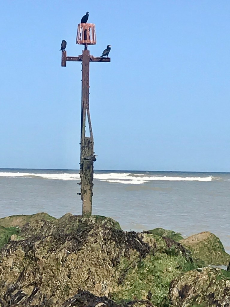 We headed for the pier and watched a team of divers inspecting the ancient cast iron legs of the main pier. We moved off and walked back along the beach to East Runton. Sue had made sandwiches so we stopped on the beach and sat on a large piece of driftwood and ate our sandwiches. After watching people and finishing our lunch we again set off for the campsite.