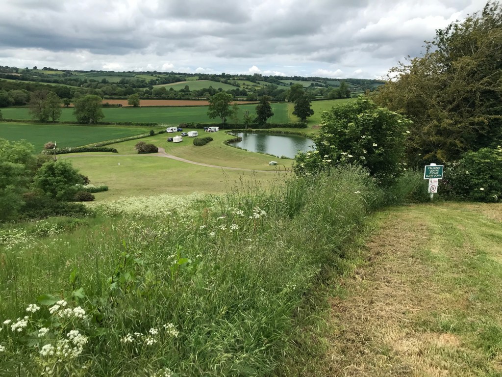 The path took us through some woodland as it lead down to the valley floor where we passed through a gate onto a narrow track without any sign of a cow. The track started to climb and we left the wood and made our way up a steep hill past a hillside caravan site. There was an auto-trail rally in a flat field at the top of the hill.
