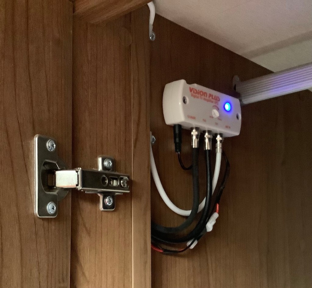 While we were waiting for the parts to arrive the existing TV signal booster died on us. I did a quick bit of research and found a Vision plus unit that others were using with our type of aerial and TV setup. Apart from rewiring and soldering the new power plug it was a straight forward swap.