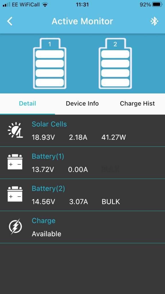 The result is that all the batteries are getting charged and the extra solar panel has doubled the charging amps so cloudy days will not be a worry.