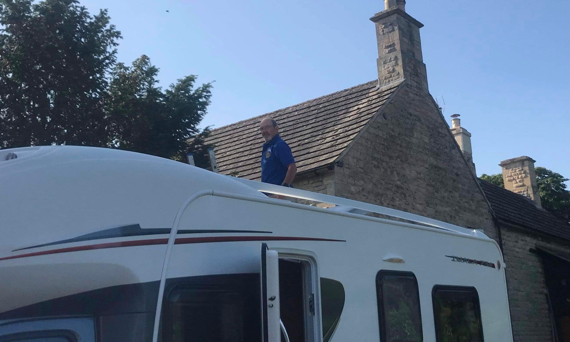 The next job was to wash the motorhome roof and mark where the panel will go. The roof was cleaned where the mounts would sit. Then it was a case of getting on the roof, applying the adhesive to the panel and then with Sue on the ladder and me on the roof, we turned the panel over and carefully placed it where marked out.