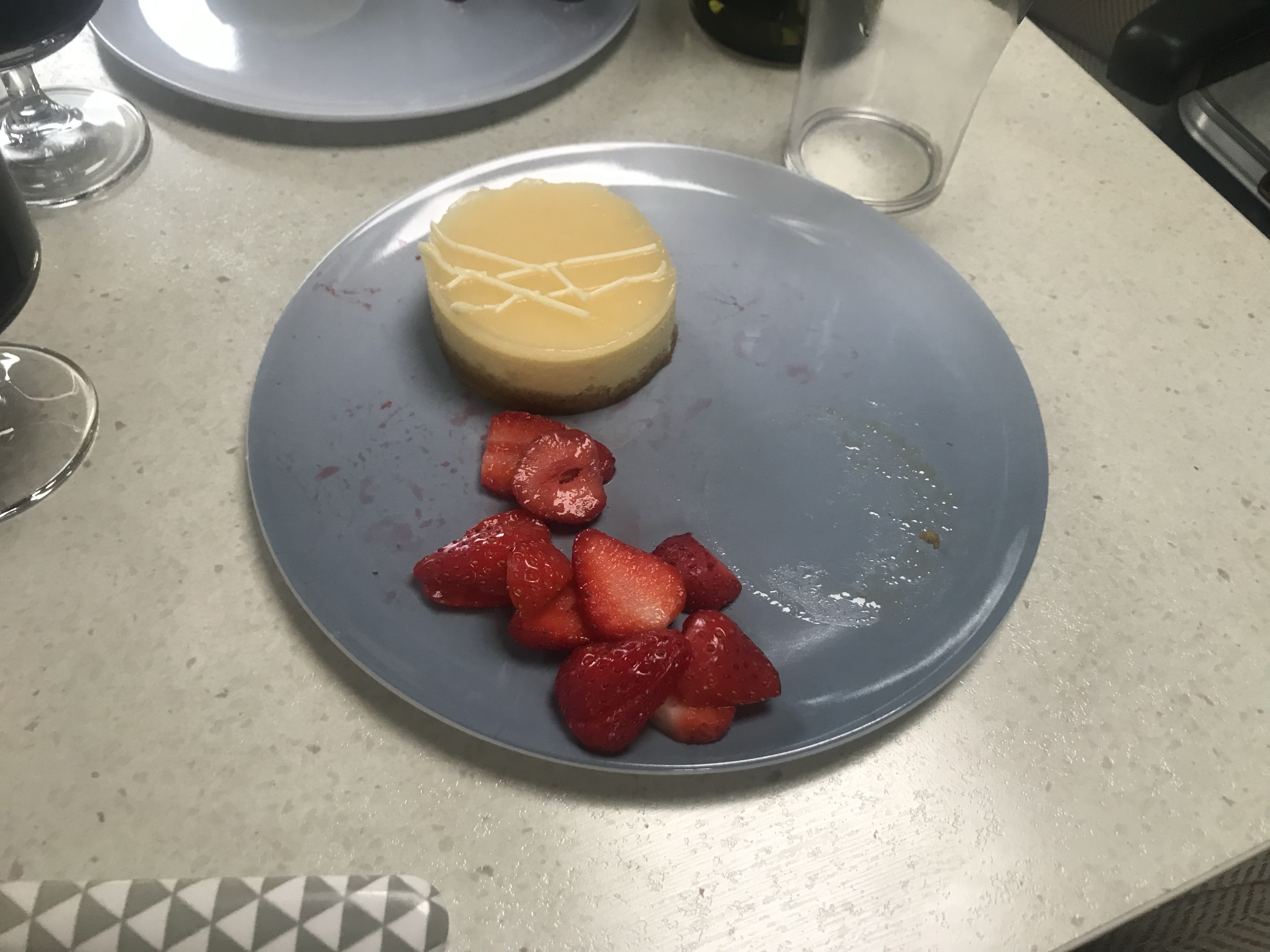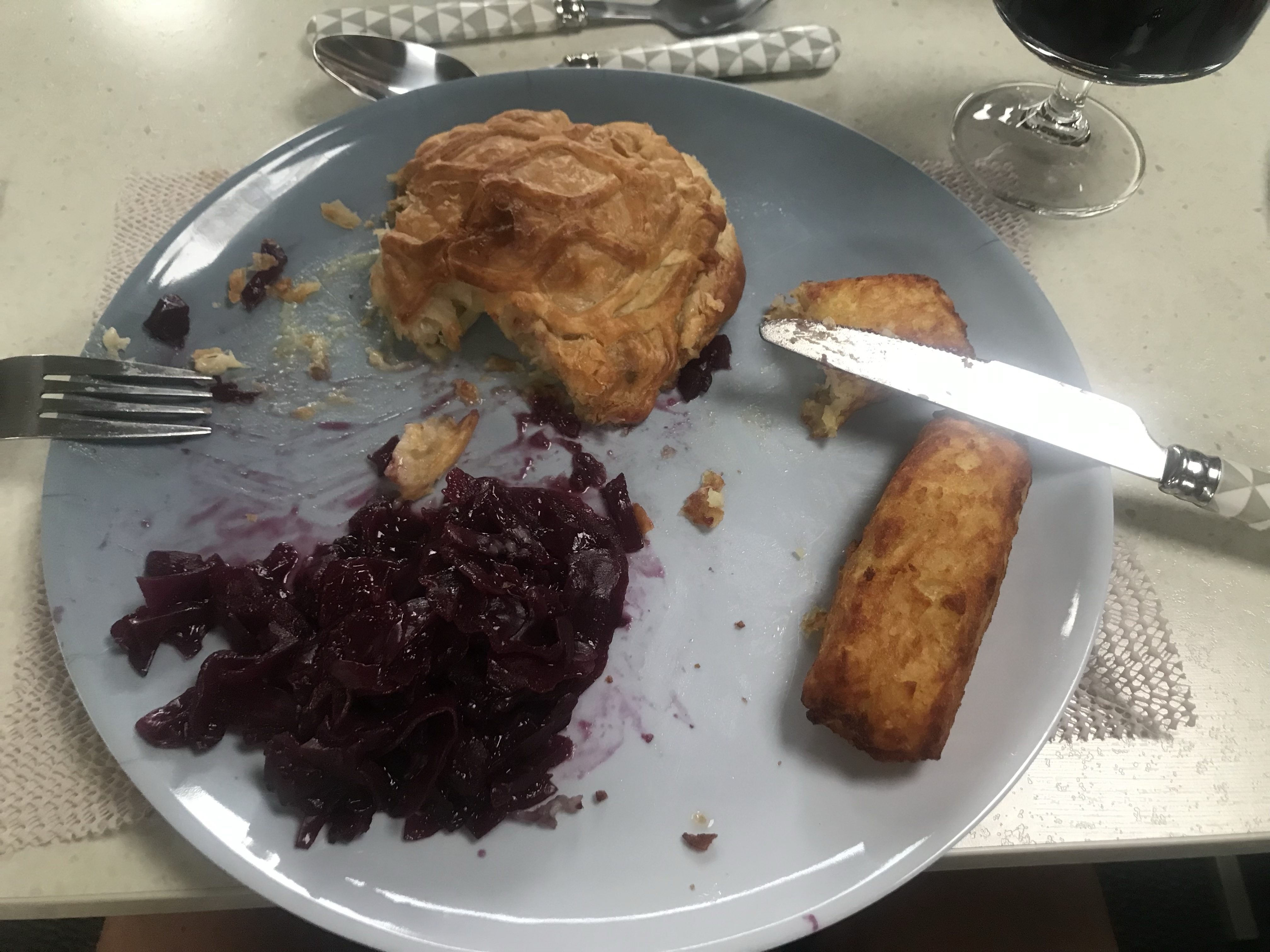 Tea tonight was inside because it was cloudy and windy. A scallop and prawn type wellington with red cabbage, and potato fritters followed by lemon meringue and strawberries.