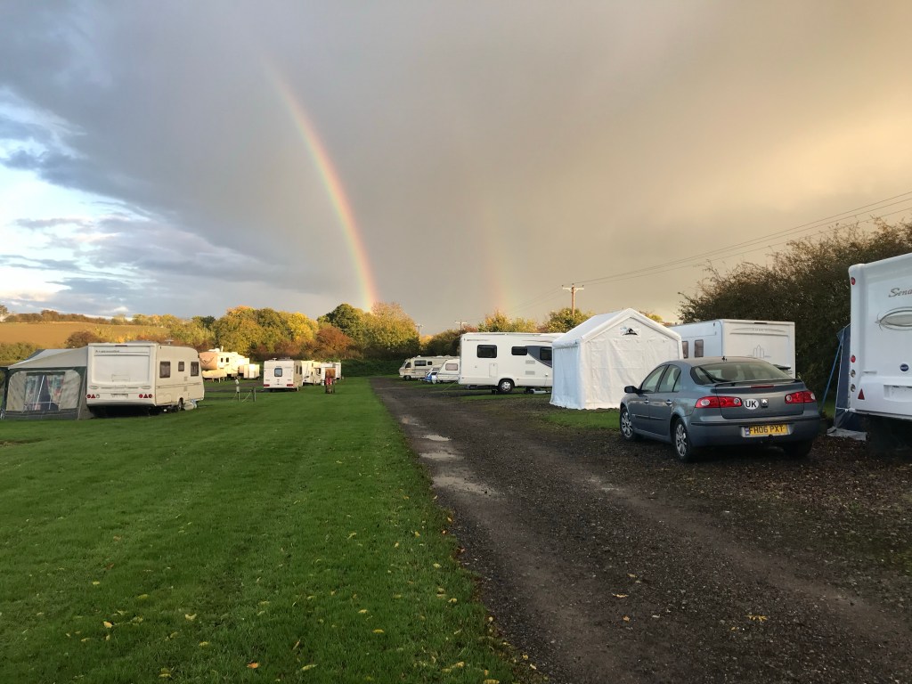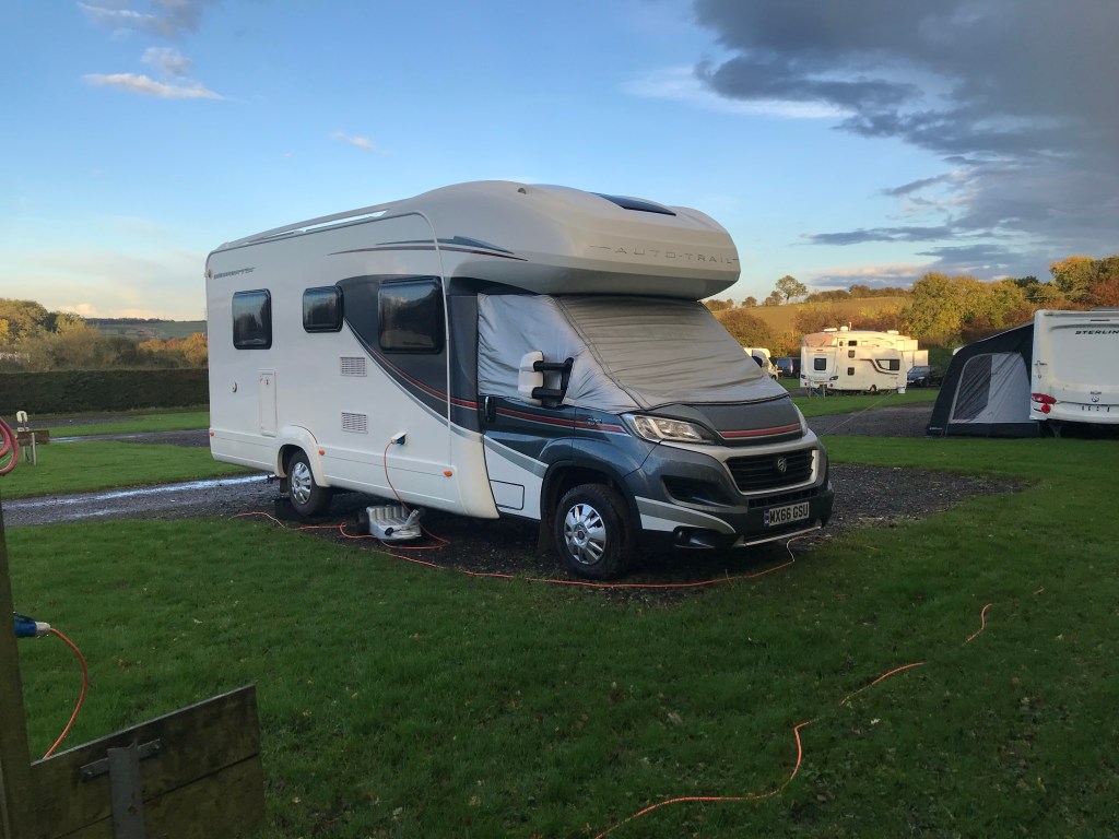 We have a pitch that is on a slope but with ramps under the back wheels we got fairly level. After lunch we were thinking about a short walk around the lakes and visit the shop but the heavens opened and stopped us.