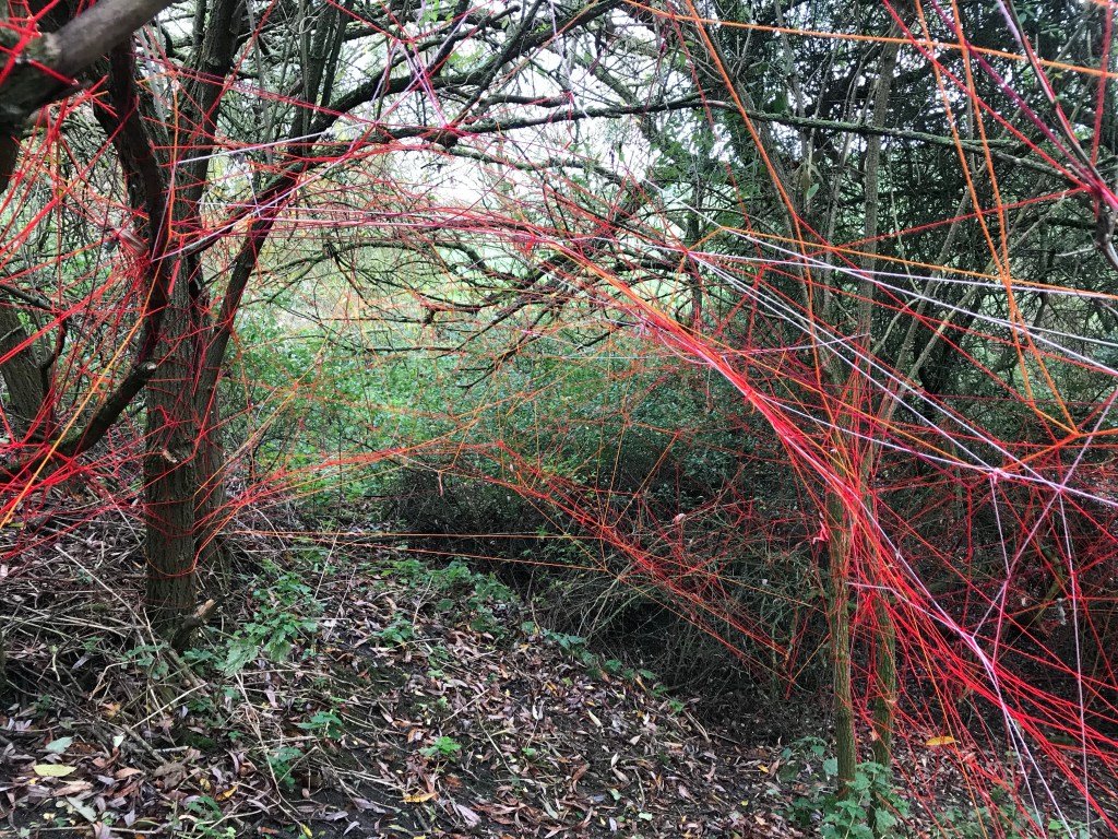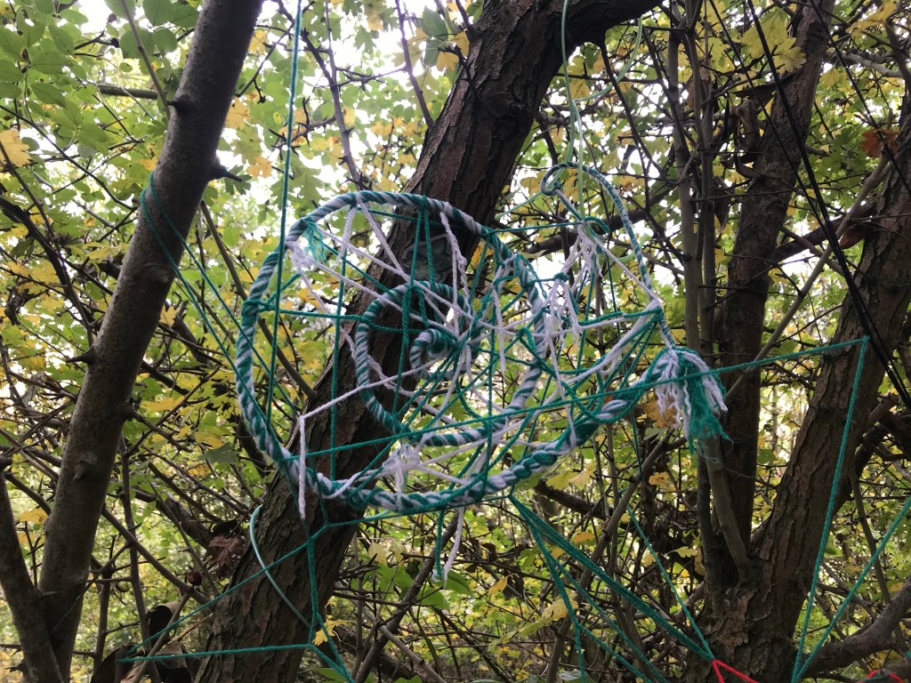 We came across a way marker and opposite it in the bushes on the embankment was a spiders web of wool, tied in with baubles.