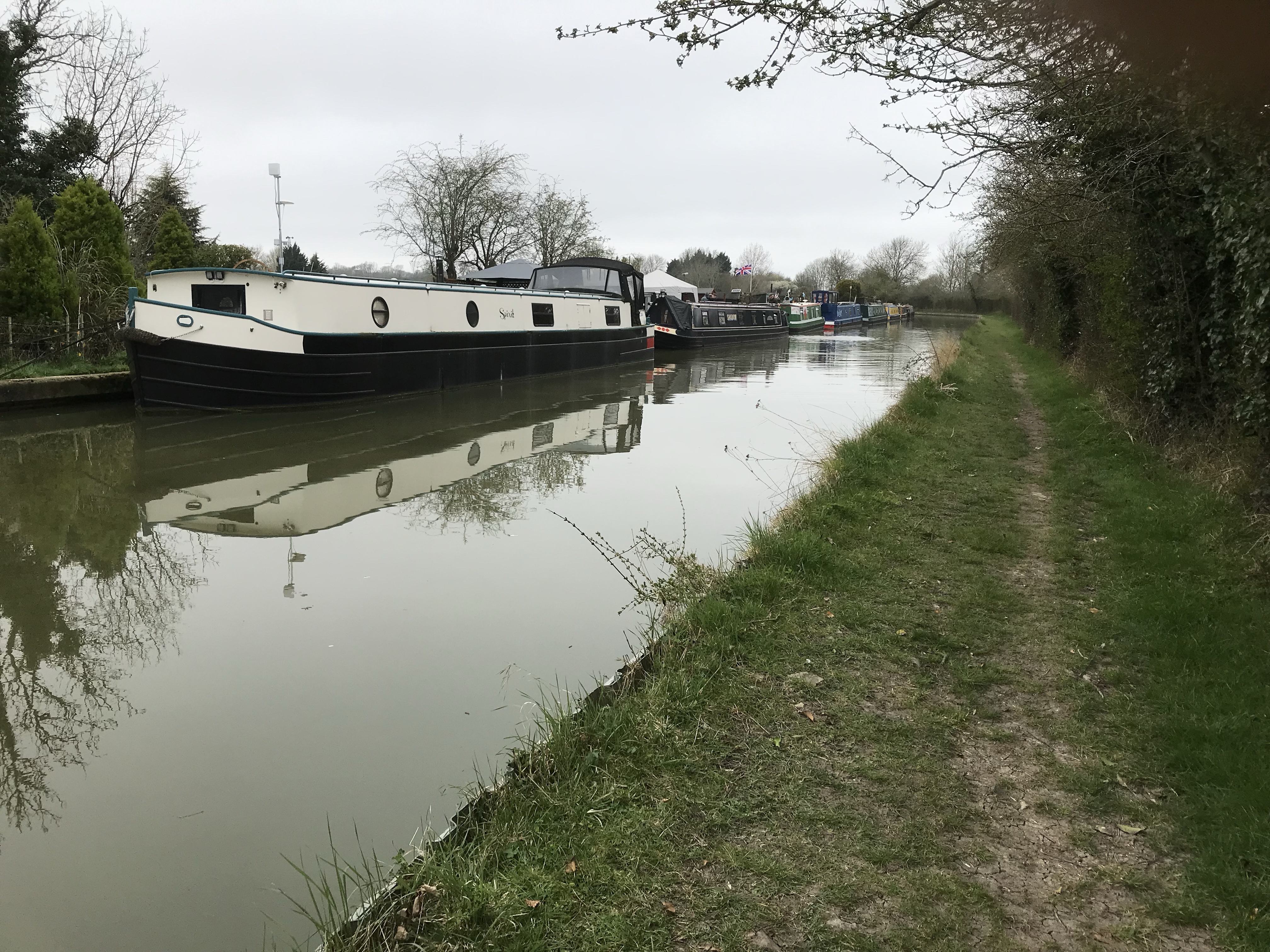 The boats moored along the canal were very varied from short narrow boats to a large barge.