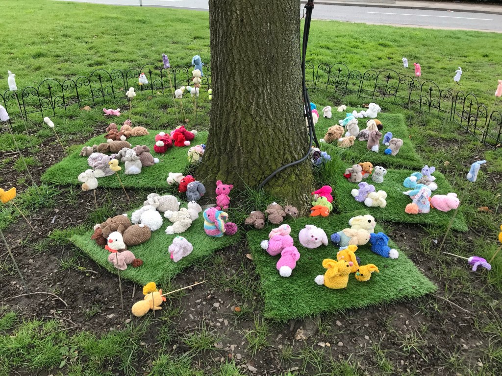Under a tree there was a collection of knitted rabbits. We left the village green and walked to the village hall that used to be a school. It was then on a circular route around a quarry lake and back to the village green.