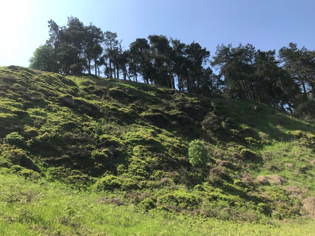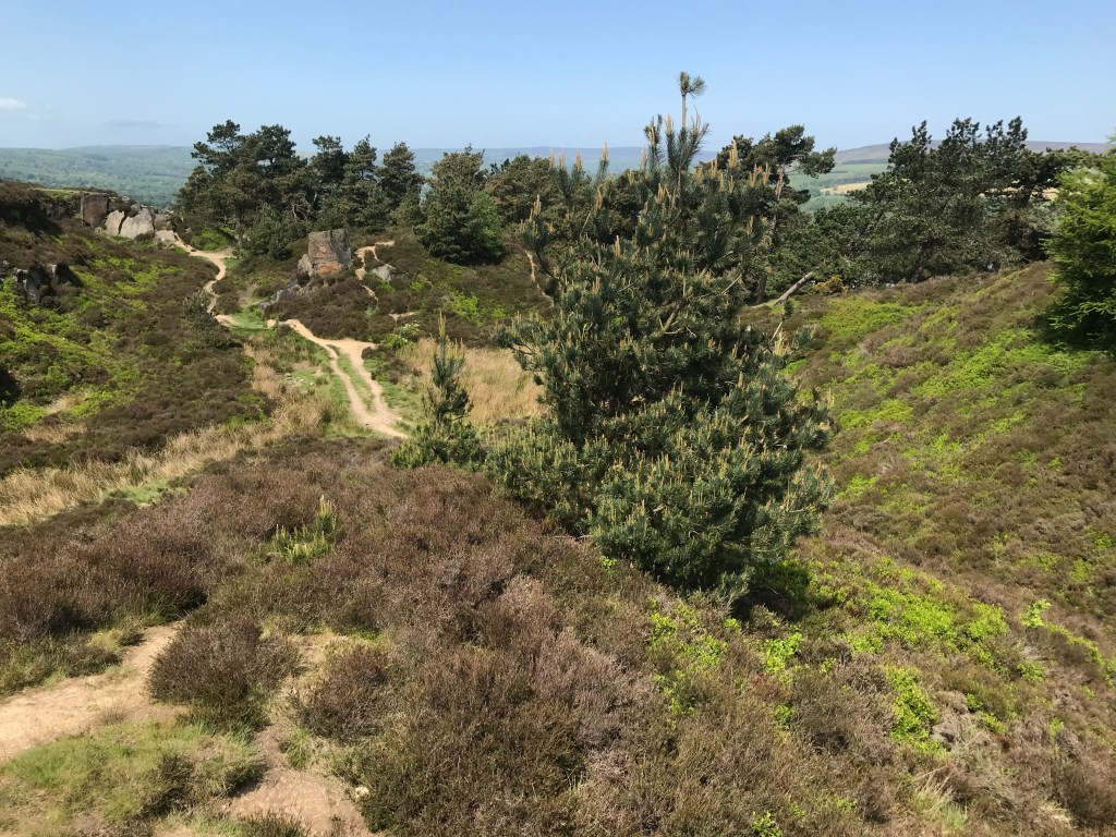 After being beaten by a sheep we followed a long steep climb to the top of this part of the moor. There was not much to see so we headed east towards the Cow & Calf rocks. Once again we arrived at the cairn and the headed down to a Spinney of pine trees where we sat and ate lunch.
