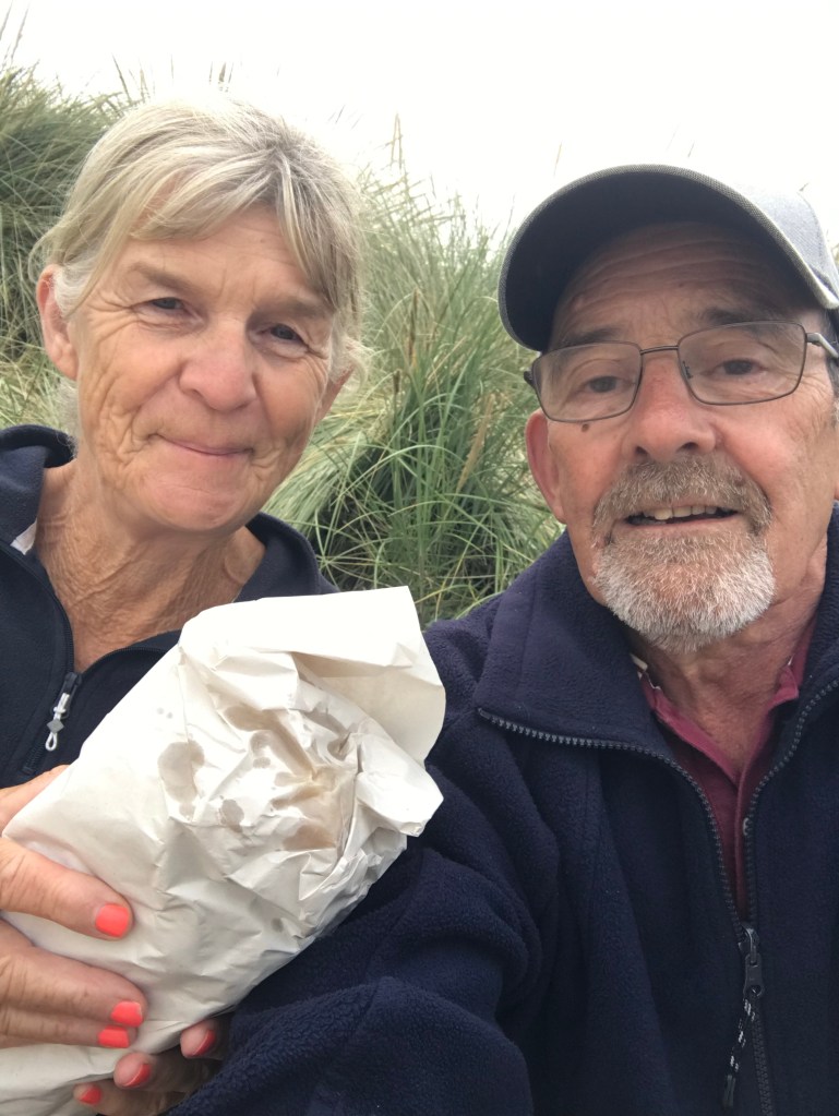 Tonight walked to the Fish & Chip shop and then walked back to the beach. We found some shelter in the dunes and ate our tea while watching a very brave family go swimming.