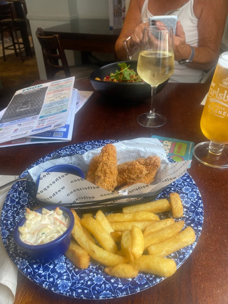 Today we walked into the town and wandered around the streets taking in all the historic buildings and sculptures, there were the normal variety of statues that come alive and some buskers. Very soon we found a Wetherspoons pub, the Busy Bee. We called in and got a drink and then decided to order a meal and a drink for lunch.